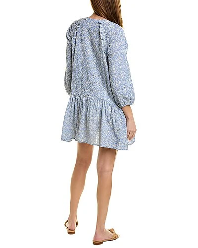 - Sea Tide Mini Dress in chambray blue/sand with embroidered eyelet design, split neckline with self-tie closure, ruffle trim, elasticized cuffs and ruffle hem