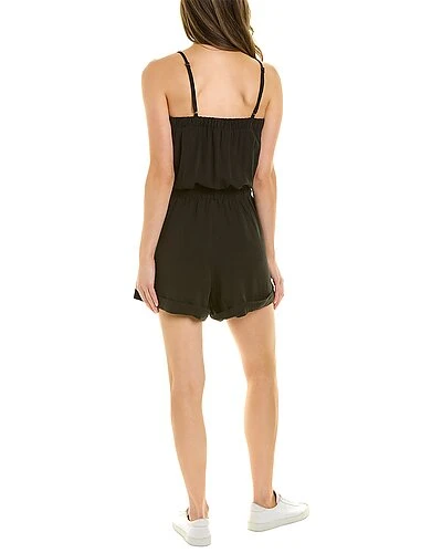 - Sedona Linen-Blend Romper in black with elasticized drawstring waist, two front pockets, adjustable shoulder straps, and cuffed hem