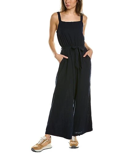 - Twila Linen-Blend Jumpsuit in navy with square neck, elasticized shoulder straps, tie belt at waist, and four-pocket styling