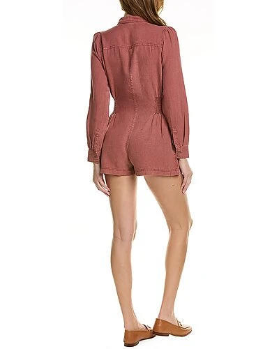 - Zion Linen-Blend Romper in penny with spread collar, dual chest pockets, smocked waist and dual front pockets