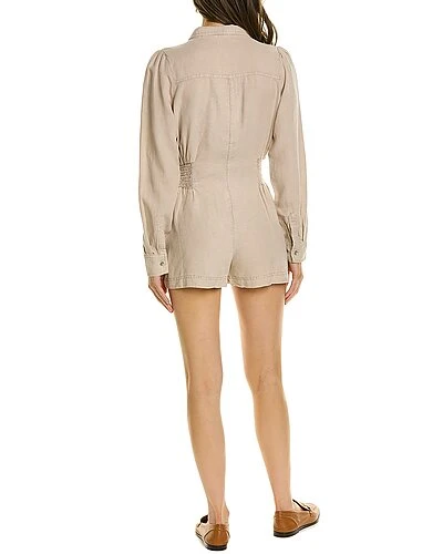 - Zion Linen-Blend Romper in latte with spread collar, dual chest pockets, smocked waist and dual front pockets