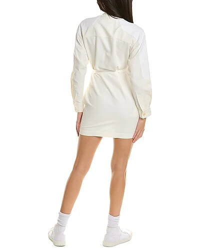 - Liana Linen-Blend Dress in white with textured trim, mock neck, dolman sleeves, button cuffs, dual side on-seam pockets, and belted waist