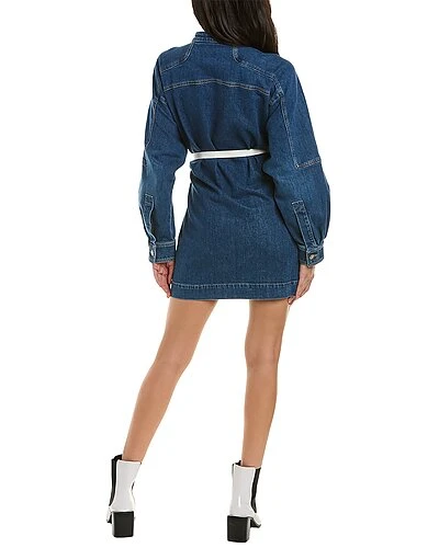 - Vintage Wash Dress in blue multicolor with mock neck, dolman sleeves, pleated button cuffs, dual side on-seam pockets, and buckle belt at waist