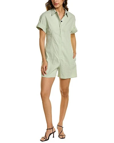 - Shirt Linen-Blend Romper in mint with spread collar, rolled cuffs, smocked back waist and dual side seam pockets