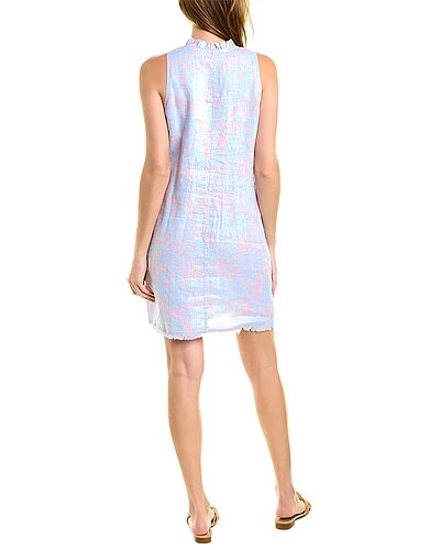 - Twin Palm Linen Shift Dress in light sky with ruffle neckline, side seam pockets, and fringe hem