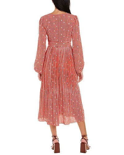 - Design details: V-neck, glitter detailing, gathered cuffs, self-tie belt at waist and pleated skirt