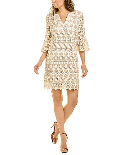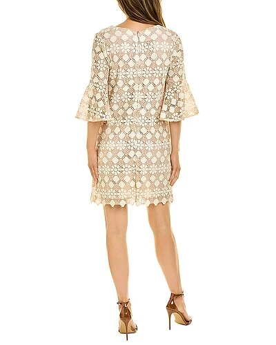 - Loomis Shift Dress in neutral with lace design, split neckline and bell-sleeves