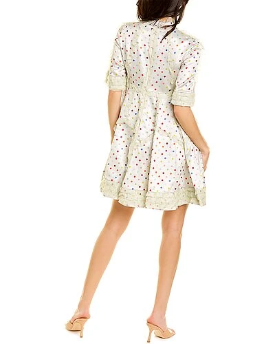 - Silk Mini Dress in matte silver with high neck, ruffle accents, and elbow-length sleeves